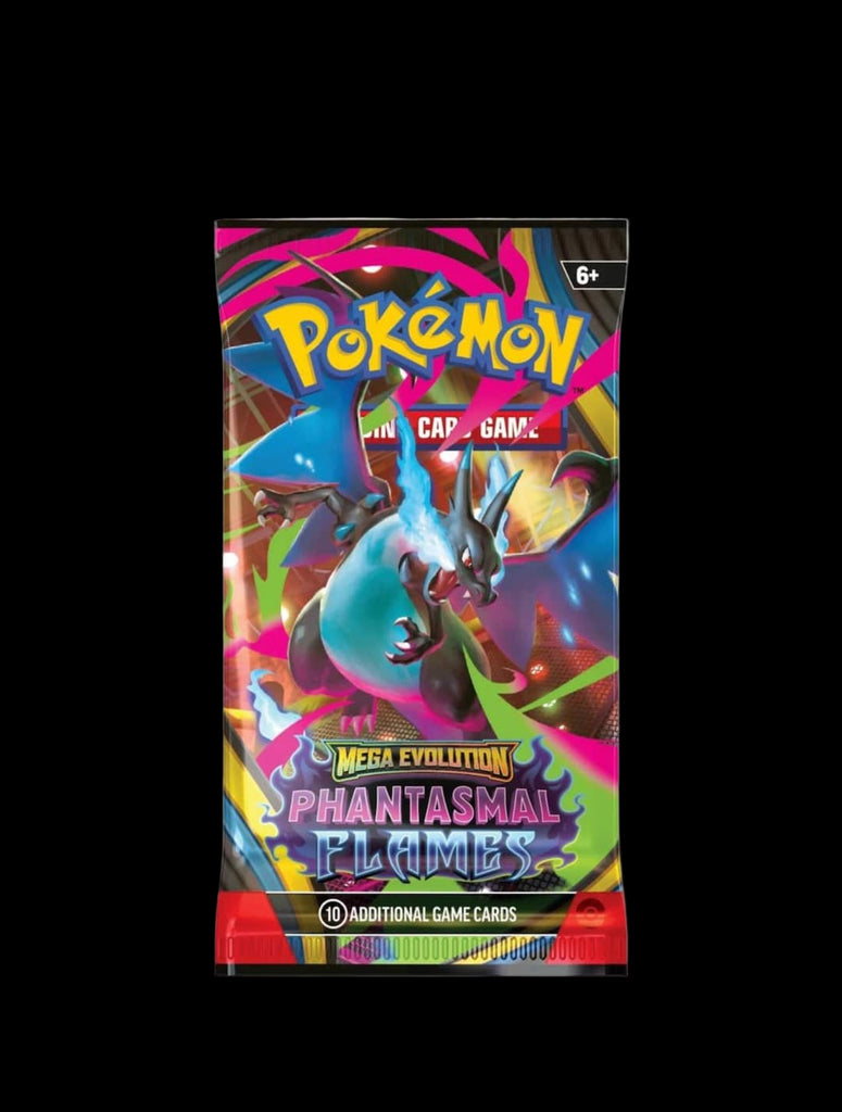 Searing blue flames rip across a dark battlefield as Mega Charizard X ex soars up and looks down upon its opponents! With a deep chill to rival the heat, the shadowy figure of Mega Gengar ex slowly rises into view, and both Pokémon prepare to attack. Determined to prove their mettle, Mega Heracross ex, Mega Lopunny ex, and even more Pokémon line up to give it their all in the Pokémon TCG: Mega Evolution — Phantasmal Flames Expansion